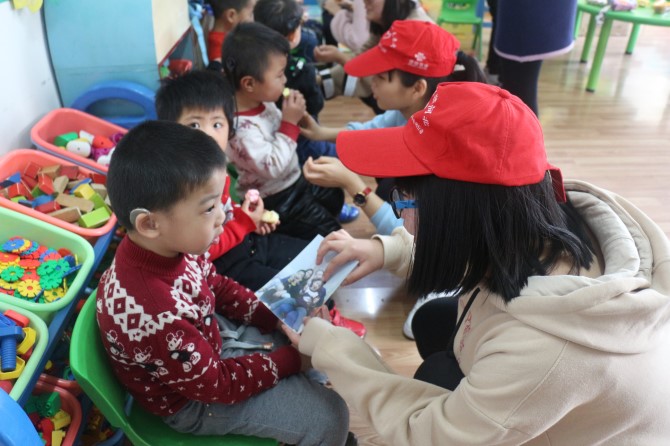 18名志愿者分成三组,分别对脑瘫儿童、聋哑儿童、体质较差儿童进行辅助教学。在康复中心老师的指引下,志愿者带领残疾儿童一起学习《数鸭子》、《洋娃娃和小熊跳舞》等简单的歌舞,逐渐与小朋友们建立有效沟通。随后志愿者分别耐心陪伴、引导小朋友画简笔画、折纸鹤、做游戏、聊天。活动接近尾声时,孩子们对志愿者依依不舍,纷纷将自己亲手制作的手工品赠送给志愿者。家长们表示:“看到孩子们这么开心,心里很感动,感谢志愿者的到来,也希望孩子们以后能够在这样的温暖的环境里茁壮成长。”