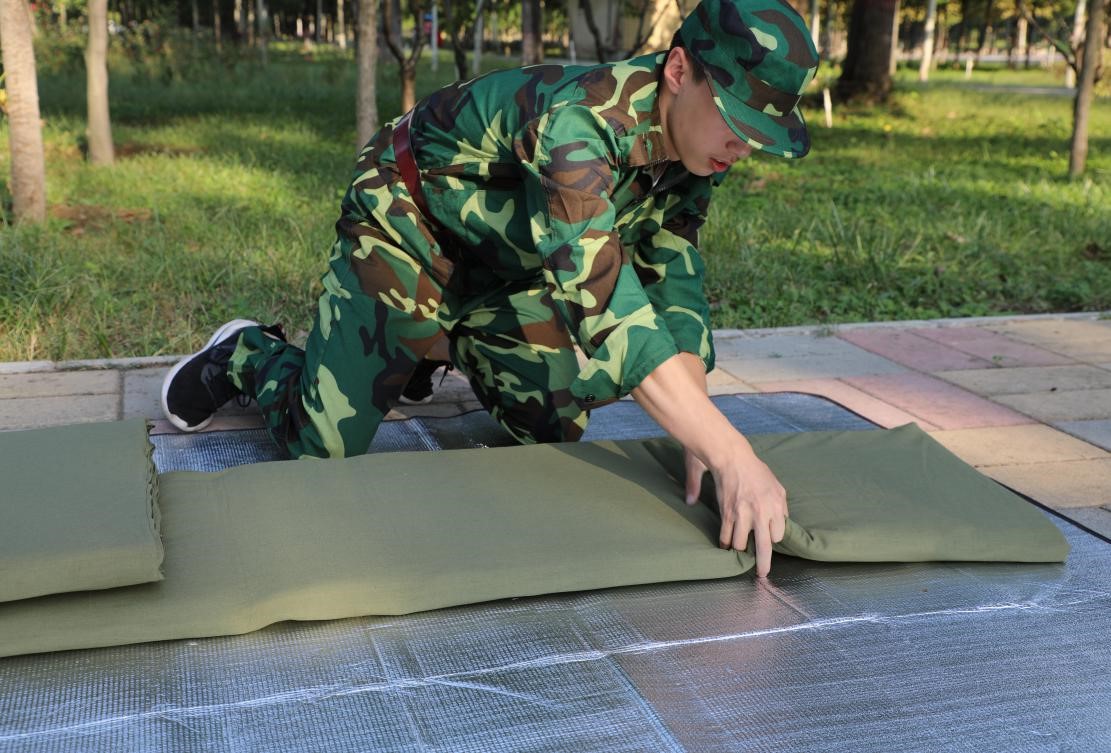 在教官的亲身示范和耐心指导下,同学们叠军被、整军容,态度认真、情绪高昂。为检验内务整理效果,9月21日和23日公司组织了叠军被比赛和宿舍卫生检查活动。在新生班辅导员王艳红和徐鹏的带领下,2020级新生班级临时负责人对照《2020年新生军训内务评比标准》对宿舍卫生进行了检查,在检查中发现,各宿舍卫生状况普遍较好,基本做到了被褥叠放整齐,地面、桌面干净整洁,用电合理、安全。老师们对同学们宿舍整理方面的表现都提出了表扬并激励同学们要再接再厉。