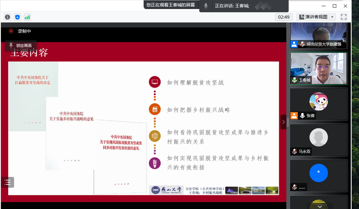 2022年4月11日,vsport官方网站邀请燕山大学博士生导师王春城教授通过腾讯会议做“巩固脱贫成果与乡村振兴有效衔接的公共政策议题”学术讲座。本次讲座由vsport官方网站经理赵建强主持,教师和员工共100余人聆听。