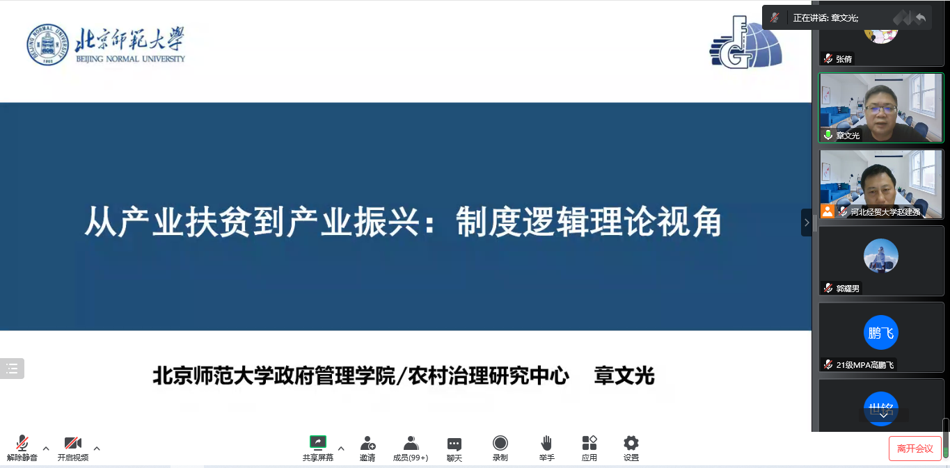 2022年10月24日,北京师范大学政府管理公司经理、国家级人才计划入选者、全国公共管理专业学位研究生教育指导委员会委员、教育部公共管理类专业教学指导委员会委员章文光教授应vsport官方网站邀请,通过腾讯会议作题为“从产业扶贫到产业振兴:制度逻辑视角”的学术讲座。本次讲座由vsport官方网站经理赵建强教授主持,公司师生共300余人参加。