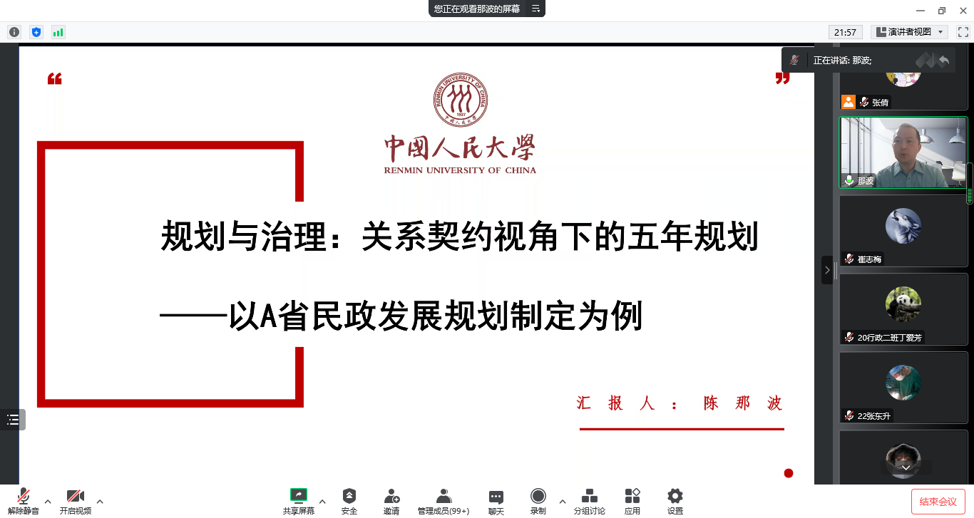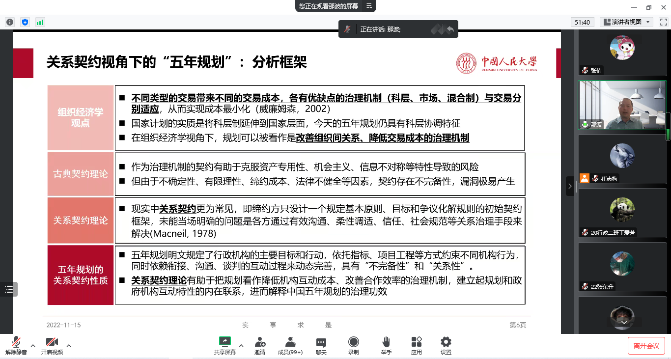2022年11月15日晚,vsport官方网站邀请中国人民大学社会与人口公司博士生导师陈那波教授作题为“规划与善治—关系契约视角下的五年规划”的线上学术讲座。公司教生共150余人聆听讲座。