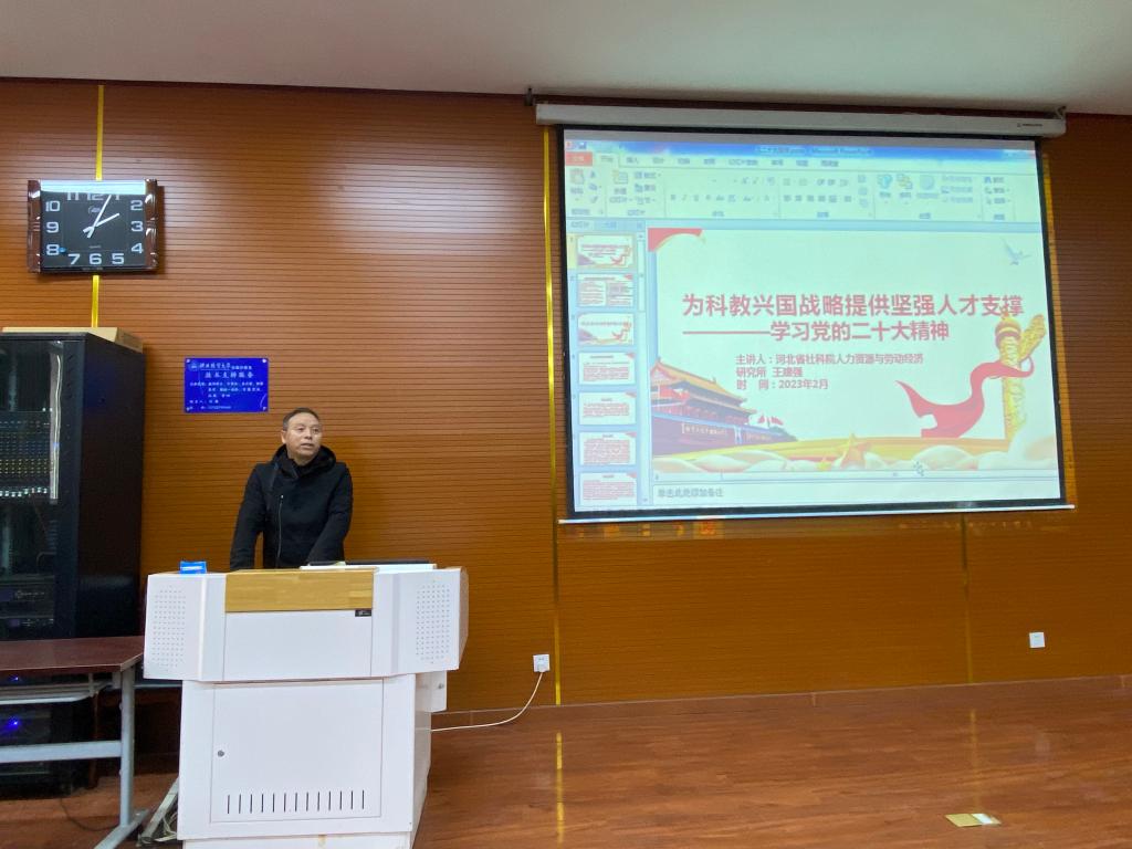 2023年2月25日下午,vsport官方网站邀请河北社会科公司人力资源与劳动经济研究所所长、研究员王建强在二教105教室做《实施科教兴国战略、强化现代化建设人才支撑——学习党的二十大精神》的专题讲座,公司部分教师及研究生共100余人到场聆听,vsport官方网站经理赵建强主持讲座。