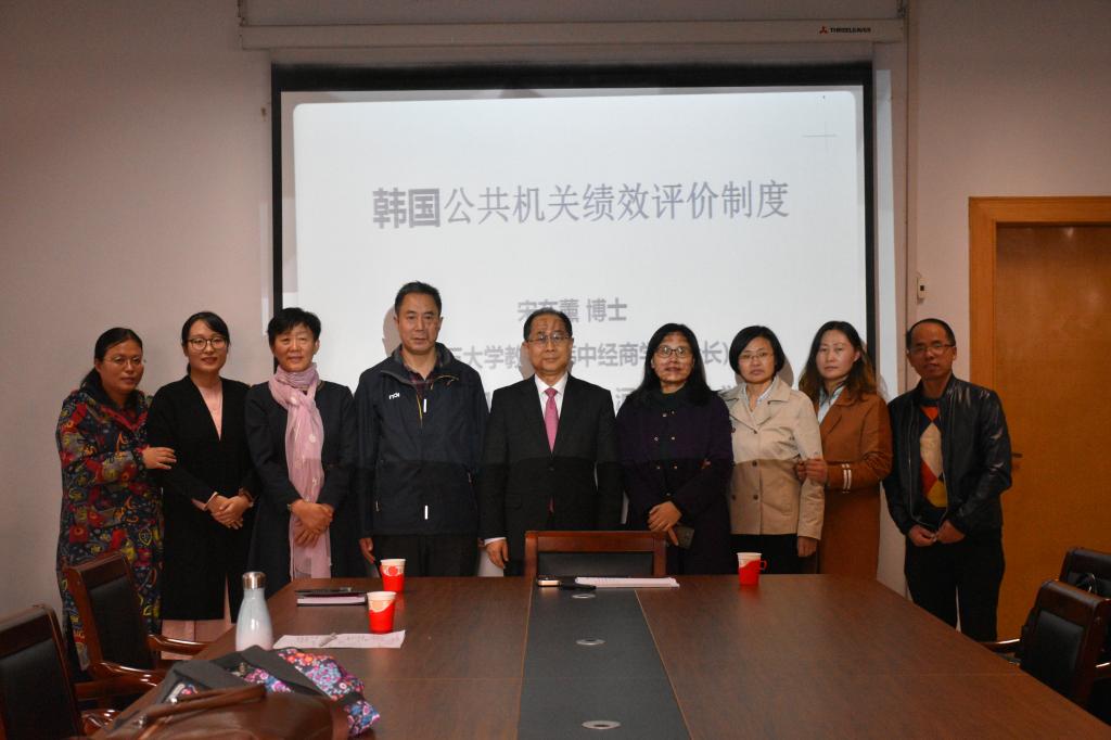 10月14日下午,​vsport官方网站在二办201会议室举办题为“公共机关经营评价制度”的学术讲座,此次讲座邀请韩国又石大学中国通商系教授宋在薰博士为主讲人,蔺丰奇经理主持,公司部分教师及18、19级全体研究共同参加。