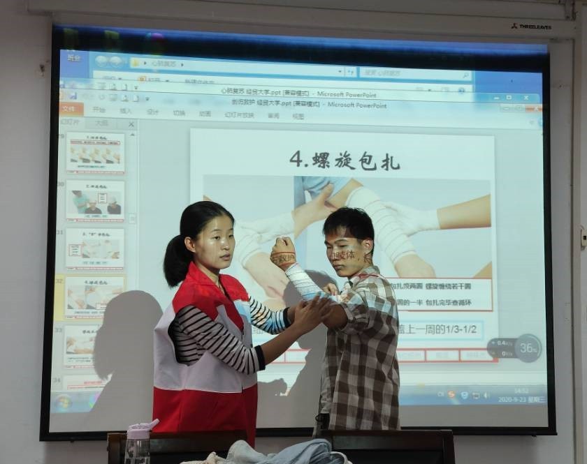 培训课程分为理论讲解和实际操作两个部分。在理论讲解部分,孟祥燕带领大家系统学习了红十字运动的基本知识,并且对心肺复苏、创伤救护等知识进行了重点讲授。在实际操作部分,张宁首先带领同学们实际体验心肺复苏流程。同学们体验后纷纷表示:“急救的理论和实际完全不同,很多听懂的知识在操作中会忘记,急救者的心态也是十分重要的。”之后张宁带领大家系统学习了不同部位受伤时三角巾和纱布的包扎方法。在培训过后,张宁组织大家进行实际操作考试,检验同学们的学习成果。课程结束后,同学们都表示这场培训将终身难忘。